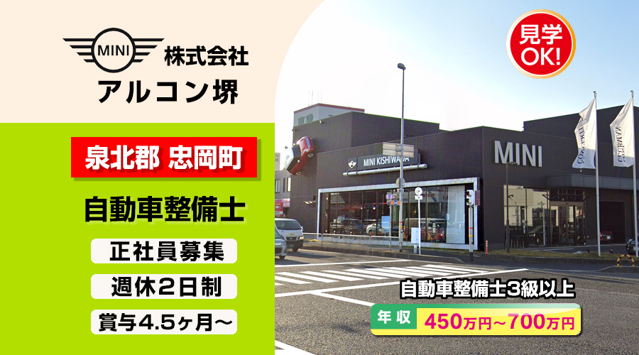 株式会社アルコン堺(MINI岸和田店)【アルコン堺】 自動車整備士・メカニック(泉北郡忠岡町高月南)