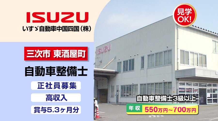 いすゞ自動車中国四国株式会社(三次支店・三次サービスセンター)【いすゞ自動車中国四国】 自動車整備士・メカニック(三次市東酒屋町)