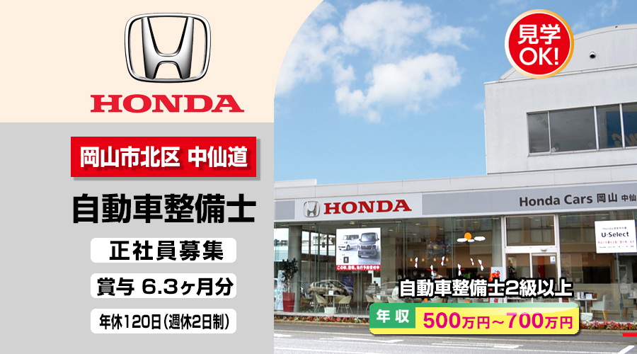 株式会社ホンダモビリティ中四国 (ホンダカーズ岡山 中仙道店)【ホンダモビリティ中四国】 自動車整備士・メカニック(岡山市北区中仙道)