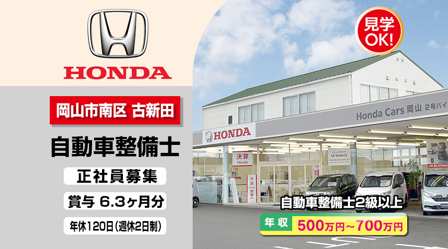 株式会社ホンダモビリティ中四国 (ホンダカーズ岡山 2号バイパス店)【ホンダモビリティ中四国】 自動車整備士・メカニック(岡山市南区古新田)