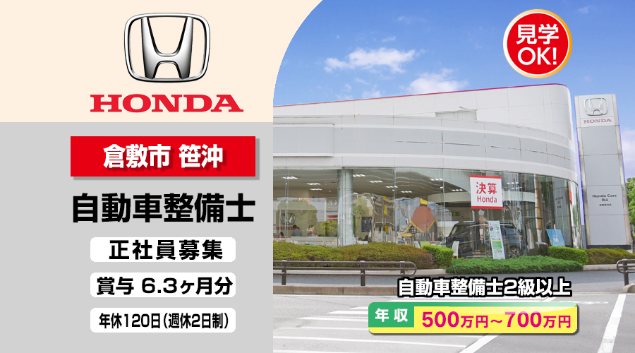 株式会社ホンダモビリティ中四国 (ホンダカーズ岡山 倉敷笹沖店)【ホンダモビリティ中四国】 自動車整備士・メカニック(倉敷市笹沖)