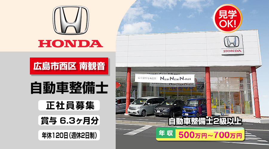 株式会社ホンダモビリティ中四国 (ホンダカーズ広島 観音店)【ホンダモビリティ中四国】 自動車整備士・メカニック(広島市西区南観音)