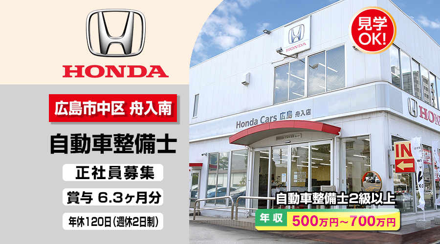 株式会社ホンダモビリティ中四国 (ホンダカーズ広島 舟入店)【ホンダモビリティ中四国】 自動車整備士・メカニック(広島市中区舟入南)