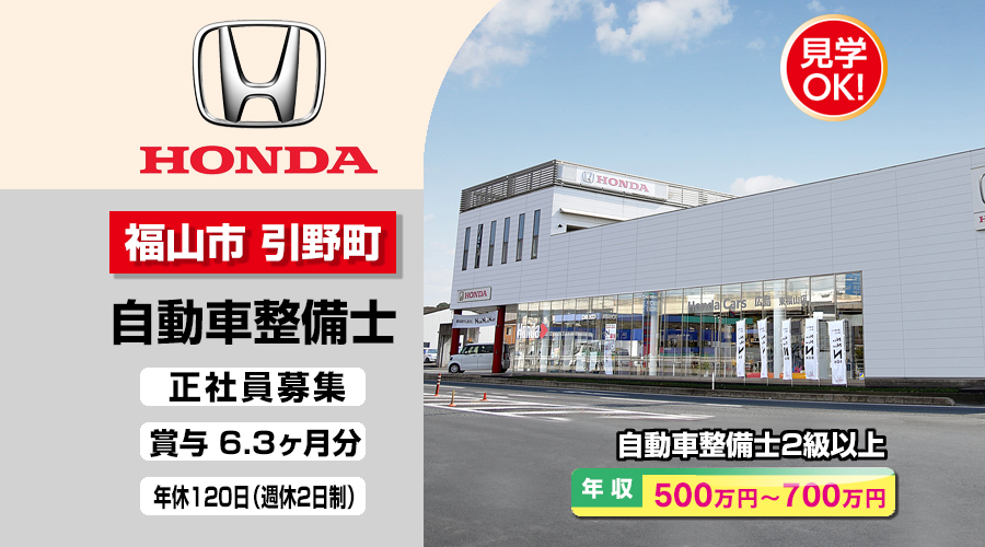 株式会社ホンダモビリティ中四国 (ホンダカーズ広島 東福山店)【ホンダモビリティ中四国】 自動車整備士・メカニック(福山市引野町)