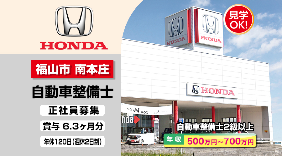 株式会社ホンダモビリティ中四国 (ホンダカーズ広島 西福山店)【ホンダモビリティ中四国】 自動車整備士・メカニック(福山市南本庄)