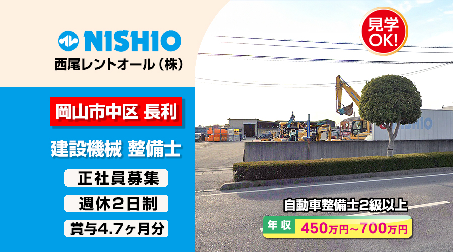 西尾レントオール株式会社 (東岡山営業所)【西尾レントオール】 建設機械 整備士(岡山市中区長利)