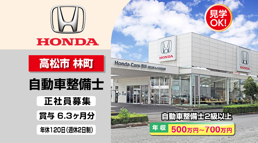 株式会社ホンダモビリティ中四国 (ホンダカーズ香川 高松東バイパス林店)【ホンダモビリティ中四国】 自動車整備士・メカニック(高松市林町)