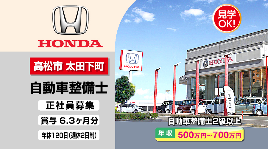 株式会社ホンダモビリティ中四国 (ホンダカーズ香川 太田店)【ホンダモビリティ中四国】 自動車整備士・メカニック(高松市太田下町)