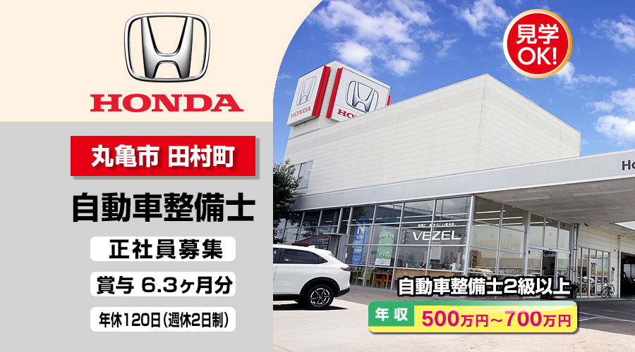 株式会社ホンダモビリティ中四国 (ホンダカーズ香川 丸亀田村店)【ホンダモビリティ中四国】 自動車整備士・メカニック(丸亀市田村町)
