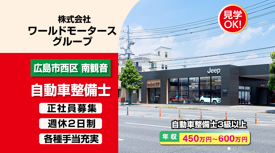 株式会社ワールドモータースグループ (Jeep 広島西)【ワールドモータースグループ】 自動車整備士・メカニック(広島市西区南観音)