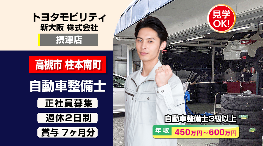 トヨタモビリティ新大阪株式会社 (摂津店)【トヨタモビリティ新大阪】 自動車整備士・メカニック(高槻市柱本南町)