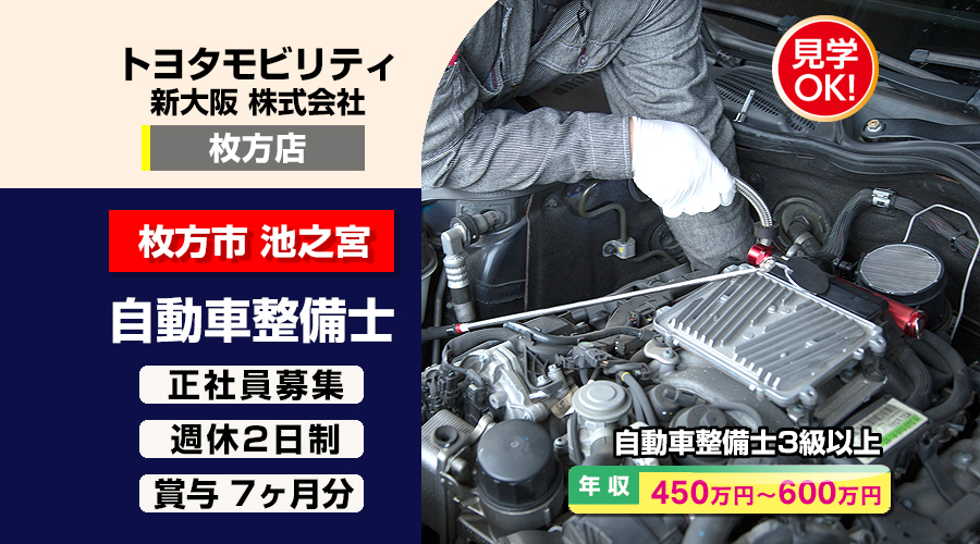 トヨタモビリティ新大阪株式会社 (枚方店)【トヨタモビリティ新大阪】 自動車整備士・メカニック(枚方市池之宮)