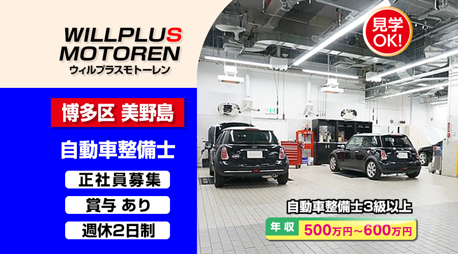ウイルプラスモトーレン株式会社【ウイルプラスモトーレン】 自動車整備士・メカニック(福岡市博多区美野島)