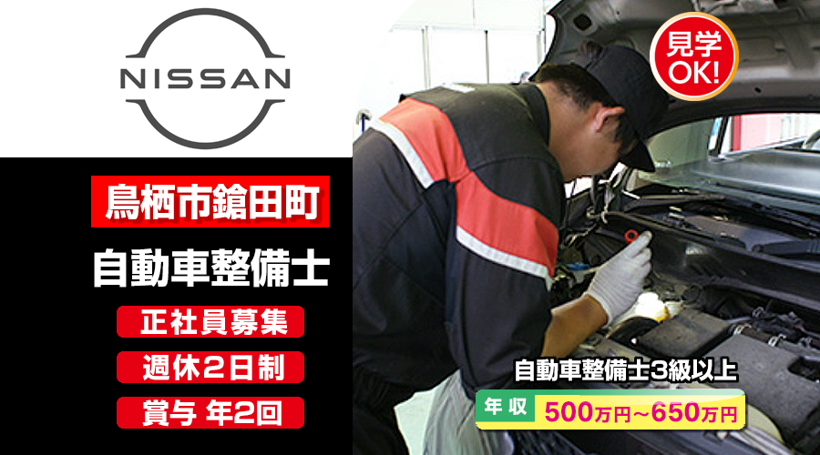 仕事内容 | 【主な業務】 ・自動車整備(点検・車検・修理)、整備入庫後の整備結果説明、整備後の調子伺い(アフターコール)などの業務を担当していただきます。 【具体的には】 ・1店舗あたりのメカニック人数は5名~12名程度。1人あたり1日4~7台程を担当します(時期による)。 ・一般ユーザーの車両を担当。日産の代表的なスポーツカーの整備に携わるキャリアも可能です。 ・整備と顧客への内容説明等の対応もお願いします。 ・同じ車両でも、点検、整備など、工程によって分業を進めています。